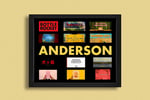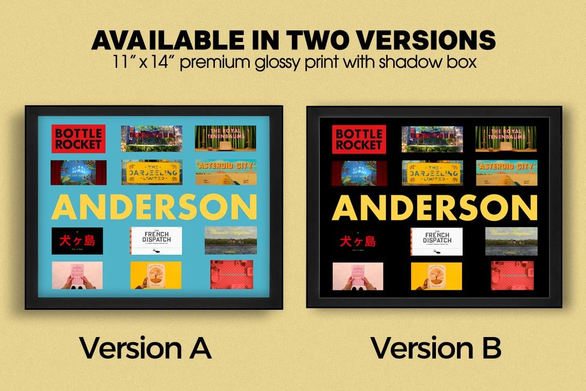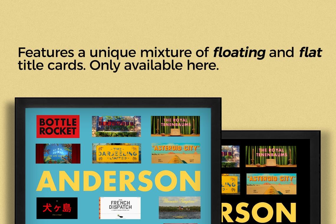 Attention Wes Anderson fans! This is a custom shadow box featuring title cards from all of director Wes Anderson's feature films (12 titles in total) including his most recent release. The frame contains a mixture of both 3D (using durable double-sided adhesive foam) and flat title cards for a unique look that will leave you mesmerized! All floating title cards are printed on premium glossy photo paper and precision-cut!